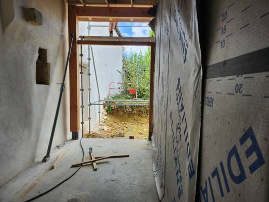 Le mur entre l'école et le PPC, remis en valeur avec les pierres apparentes, est en cours de finitions (couvertine en tuiles comme auparavant). Il restera à installer le portail entre les 2 bâtiments et à construire l'escalier.