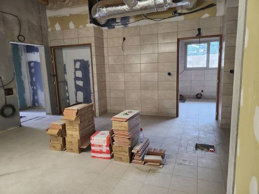 Le carrelage et la faïence sont posés, les plombiers installent les sanitaires.
