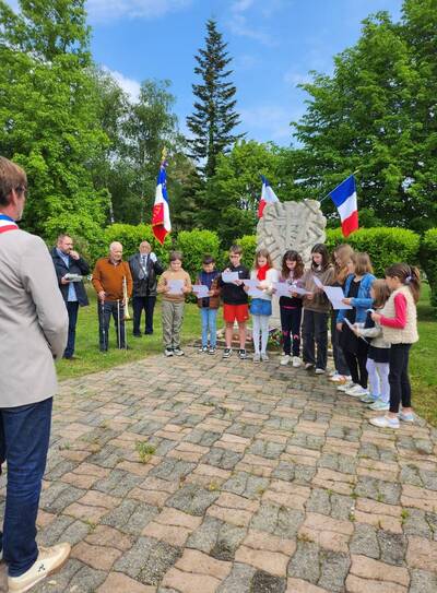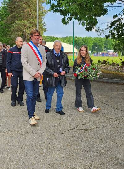 Flora et Mathilde ont déposé une gerbe en leur honneur, puis Maxime Bouchard, adjoint, a fait lecture d'un texte issu des Mémoires de Pierre CONVERT, qui nous a quitté il y a un mois, membre de l'Amicale des Anciens Combattants, une mémoire du village a qui cette commémoration tenait tant à coeur.