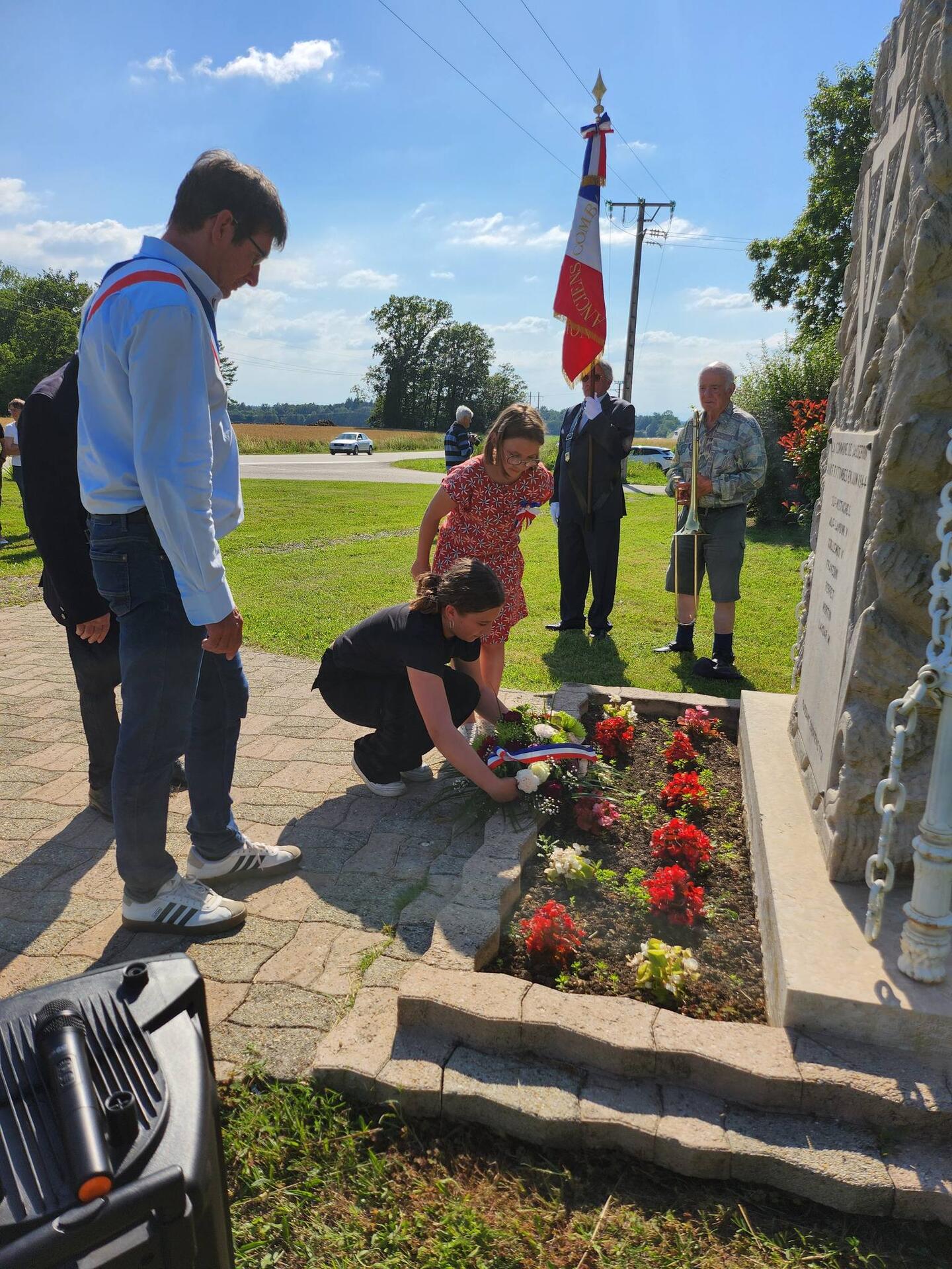 Flora et Mathilde ont déposé une gerbe en leur honneur, puis Maxime Bouchard, adjoint, a fait lecture d'un texte issu des Mémoires de Pierre CONVERT, qui nous a quitté il y a un mois, membre de l'Amicale des Anciens Combattants, une mémoire du village a qui cette commémoration tenait tant à coeur.